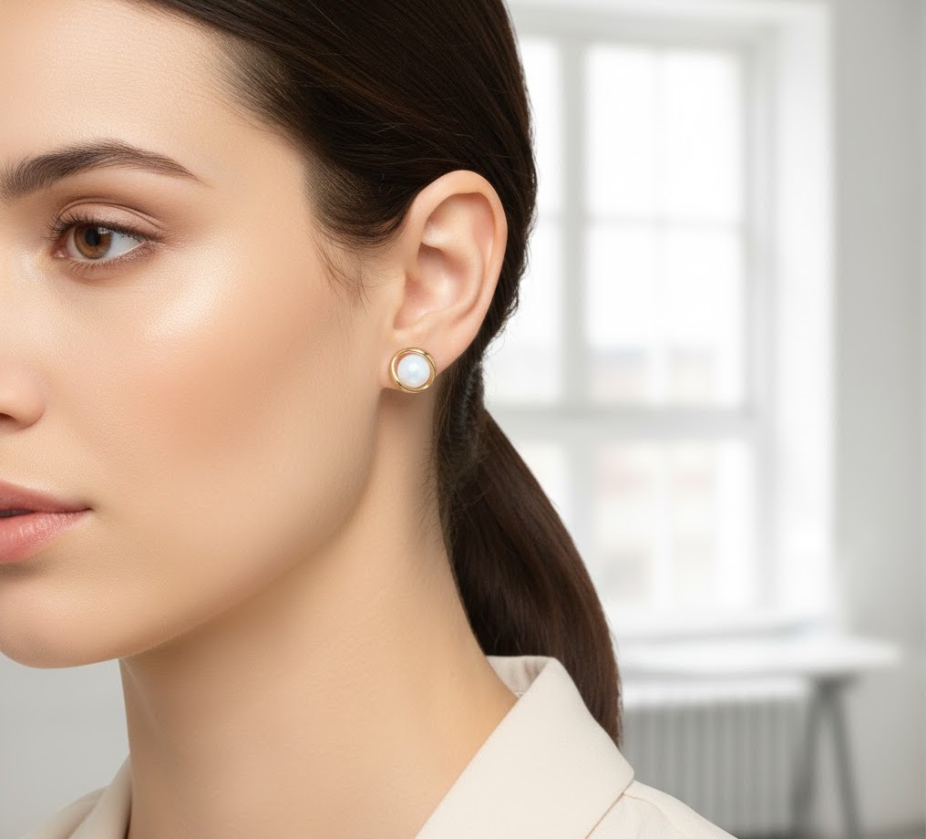 柔らかい艶を持つホワイトパールを、滑らかなゴールドサークルで包み込んだ上品なスタッドピアス。シンプルでありながら洗練されたフォルムが、耳元に自然な輝きを添えます。ミニマルデザインのためどんなスタイルにも合わせやすく、永く愛用いただけるタイムレスなアイテムです。