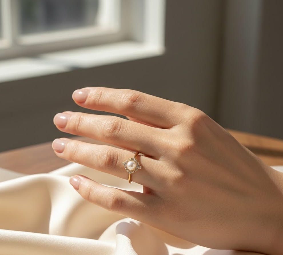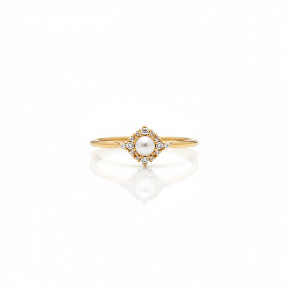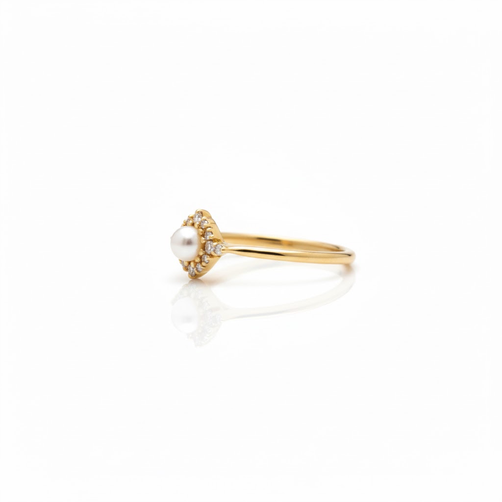 中央に艶やかなラウンドパールを配し、その周囲を繊細なCZストーンで囲んだエレガントなデザインリング。細身のゴールドアームが指元を華奢に美しく見せ、クラシックでありながら洗練された印象を与えます。普段使いにもフォーマルにも合わせやすい、上品なジュエリーです。