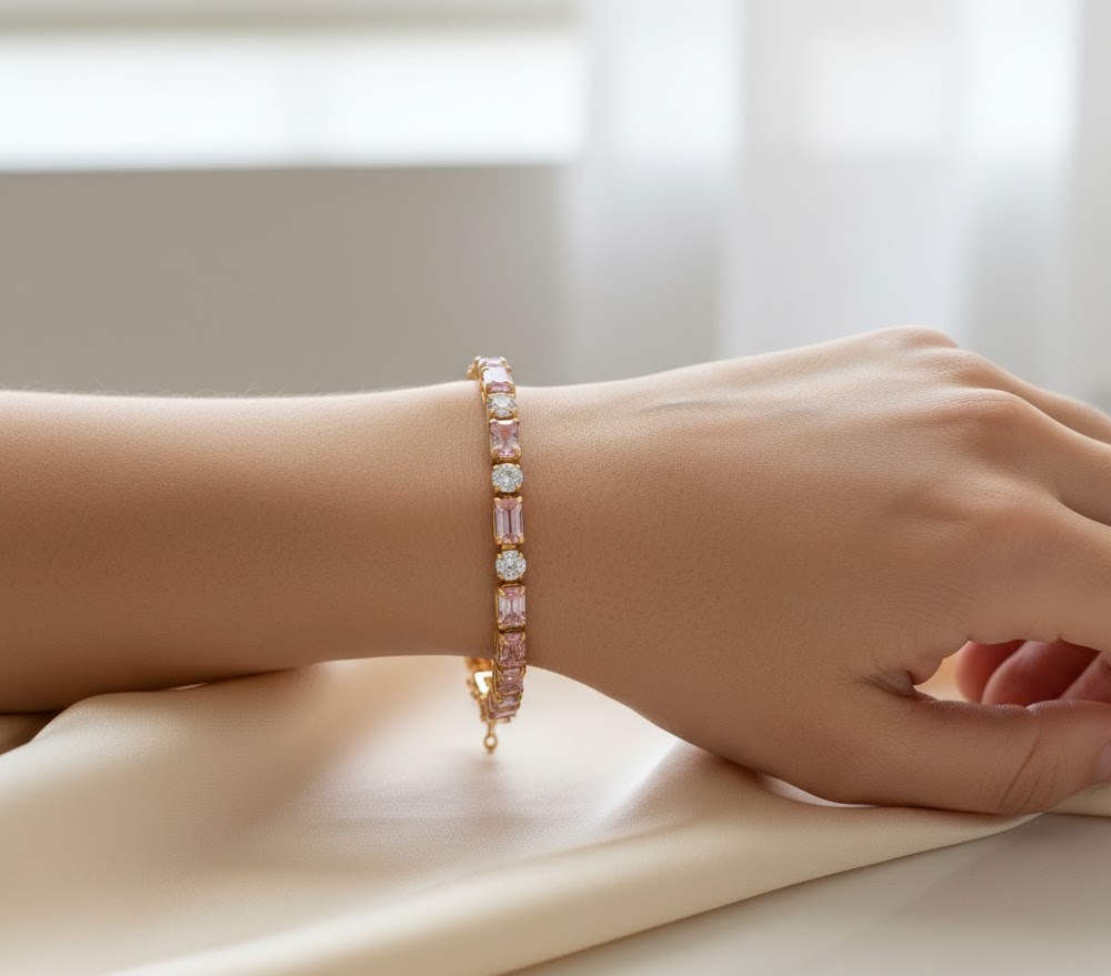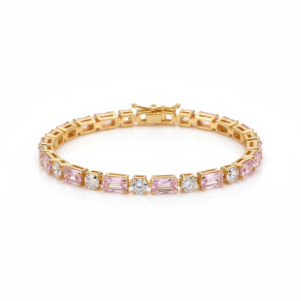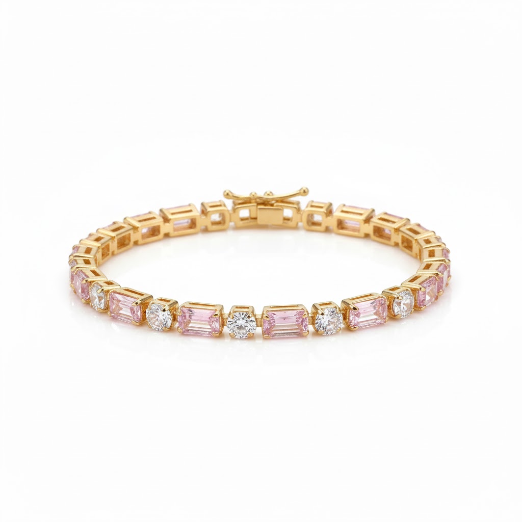 繊細なピンクのバゲットカットストーンと、輝きの強いラウンドCZを交互に並べた華やかなテニスブレスレット。ゴールドの土台が優しい色味をさらに引き立て、女性らしさと高級感が同時に手元を彩ります。上品で存在感のあるデザインは、特別な日にも日常のアクセントにも活躍します。