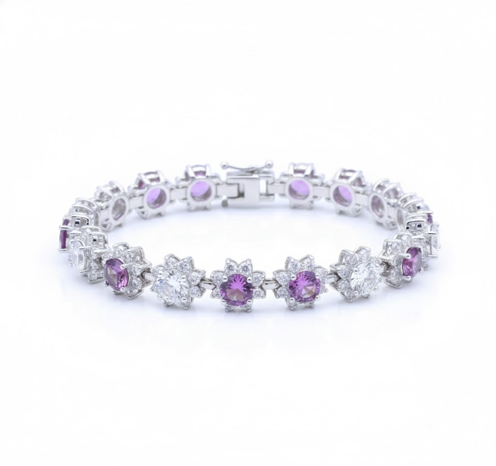 天然アメシストと高品質ダイヤモンドを花びらのように贅沢に配置した、華やかなフラワークラスター・デザイン。