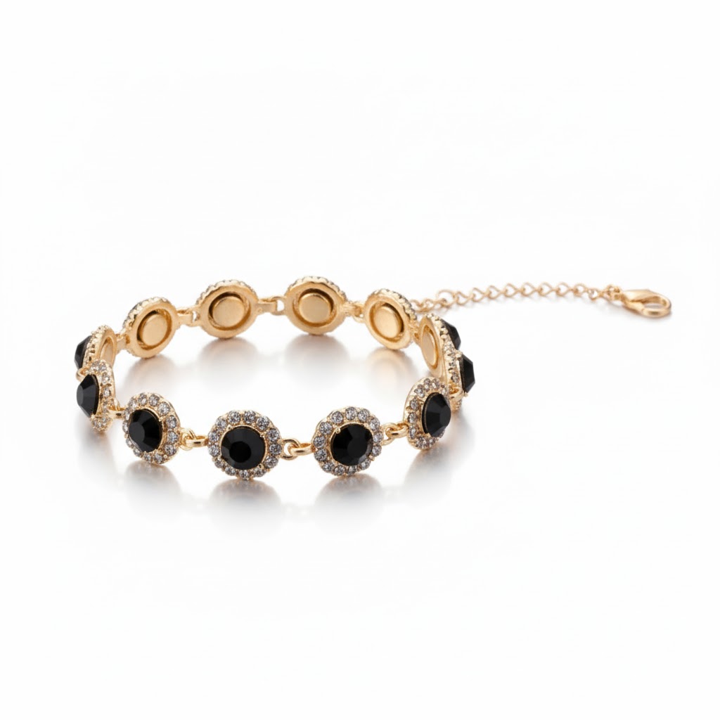 深い黒が魅力の天然ブラックオニキスをメインに、その周囲を高品質ダイヤモンドで囲んだラグジュアリーなリンクブレスレット。