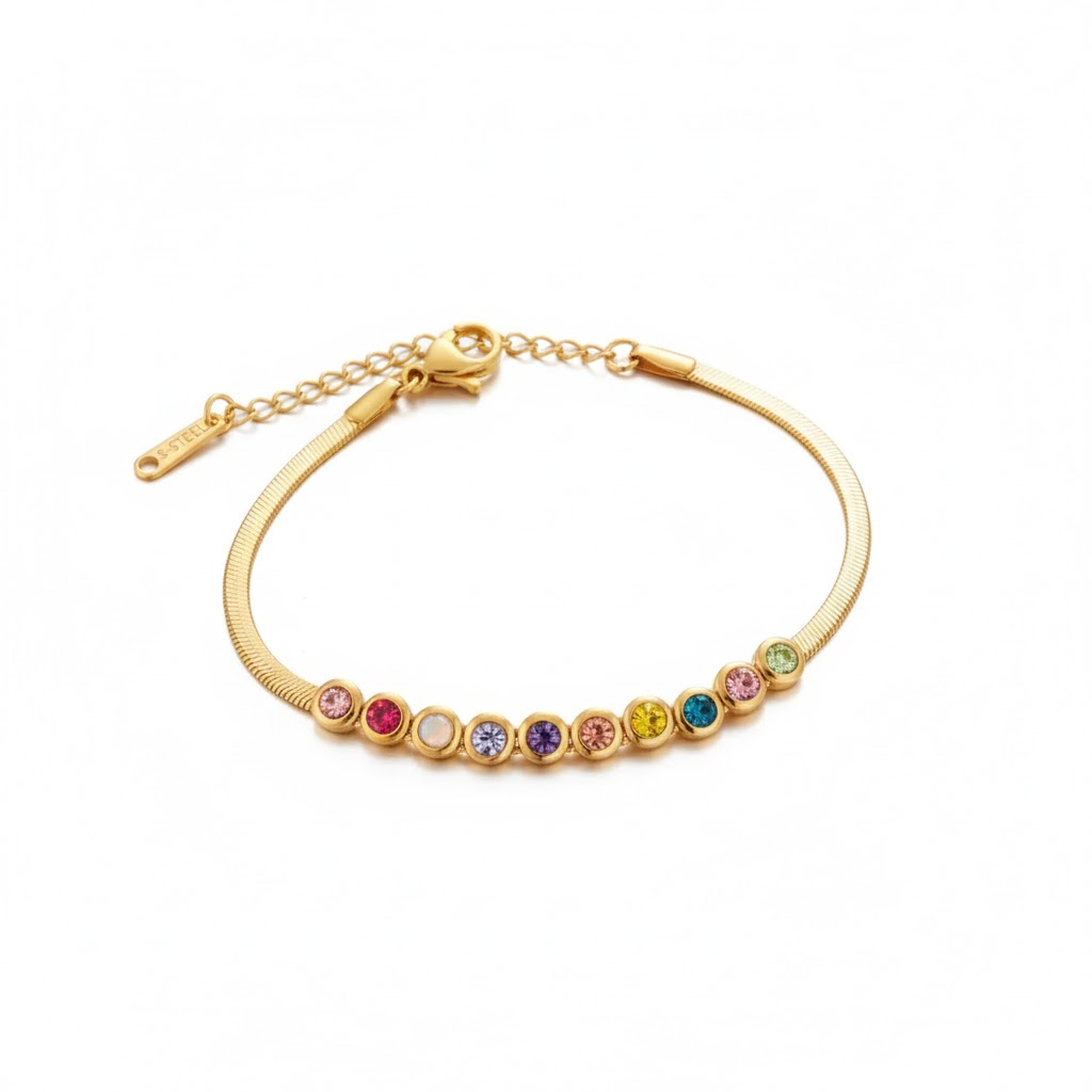 優しい色合いの天然マルチジェムをバランスよく並べた、K18YGスネークチェーンの上品なブレスレット。