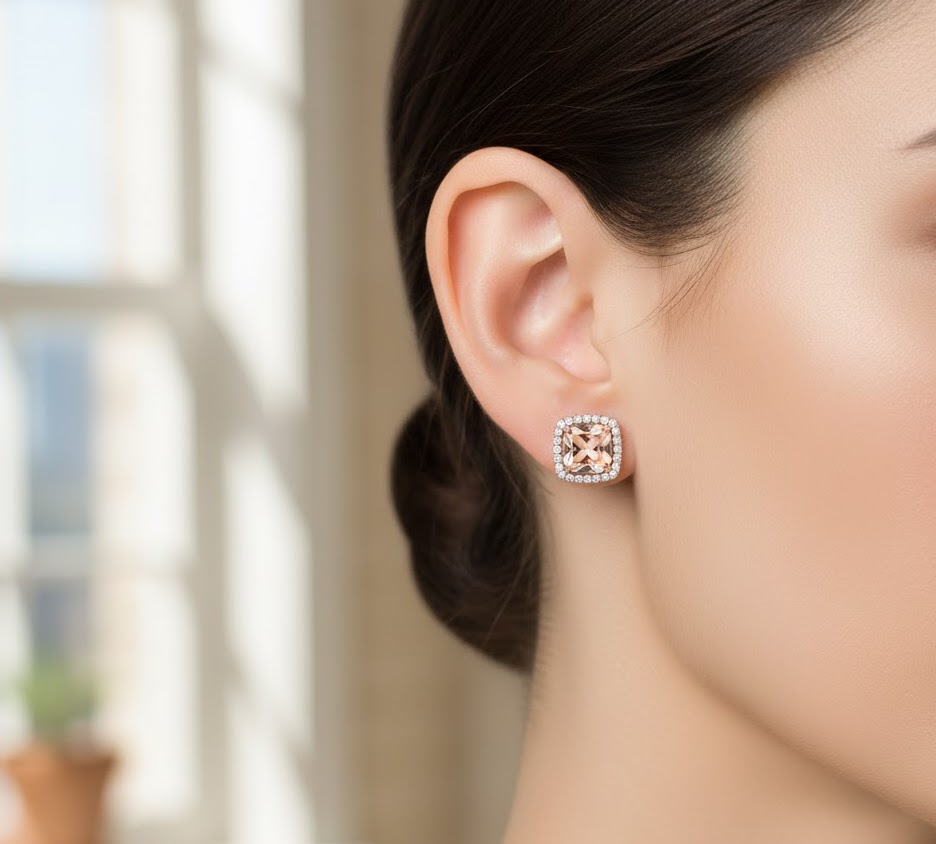 クッションカットのモルガナイトは光の取り込みが良く、肌に溶け込むような柔らかい輝きが魅力。